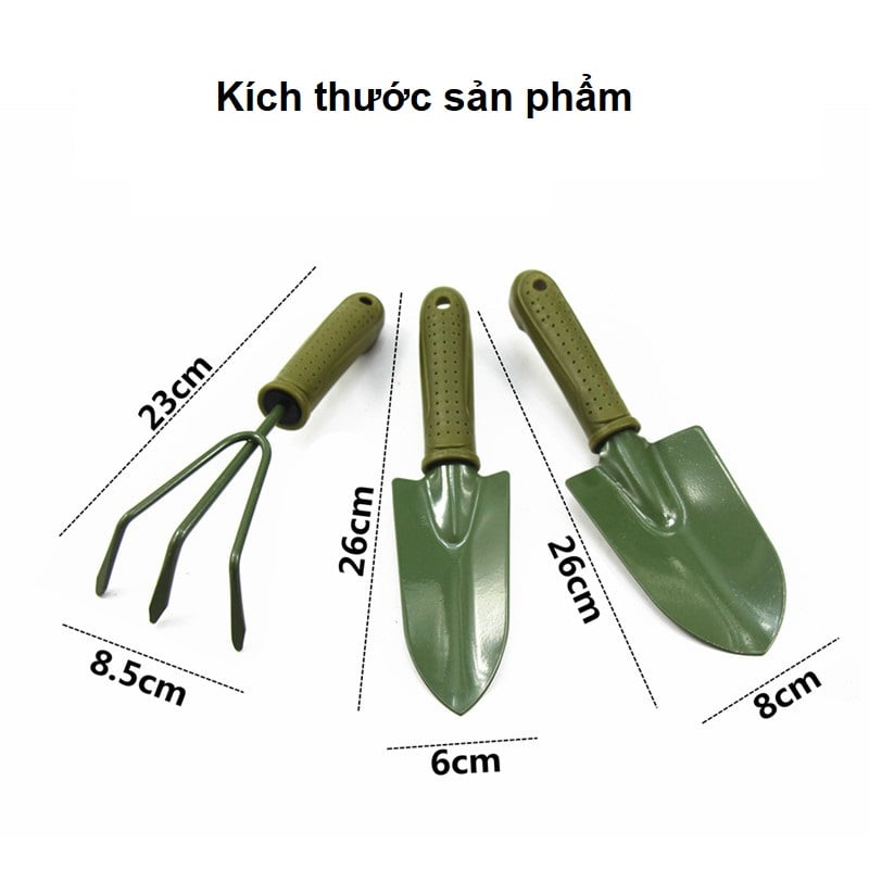 Mô tả: Bộ dụng cụ làm vườn 3 món có cán nhựa chống trượt bao gồm: 1 xẻng vuông, 1 xẻng nhọn và 1 cào. Bộ dụng cụ sử dụng tiện lợi, kiểu dáng nhỏ gọn, chất liệu lưỡi là thép siêu bền, là vật dụng không thể thiếu nếu bạn có trồng cây cảnh, trồng rau, trồng hoa.
