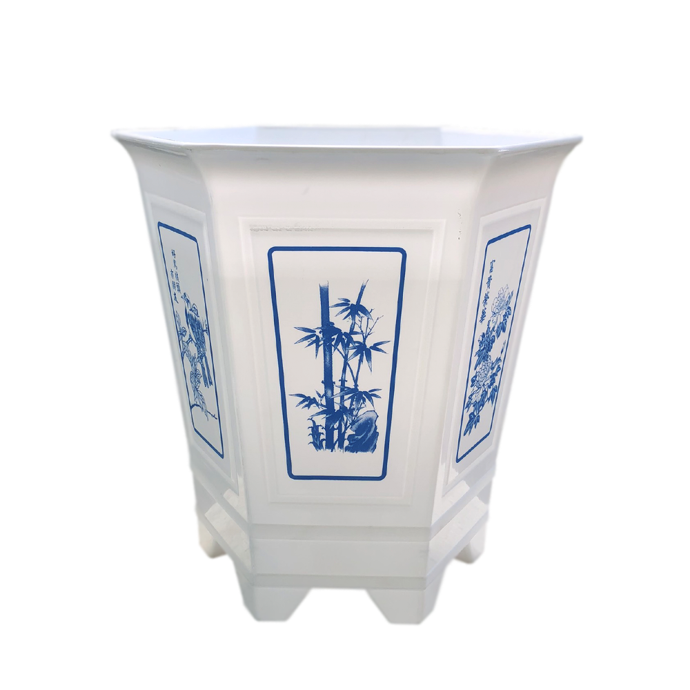 Chậu lục giác in họa tiết có 4 màu với họa tiết hoa mẫu đơn, cây trúc hay chim sơn ca được in lụa nổi bật, tạo nên nét đẹp cổ điển, trang trọng.