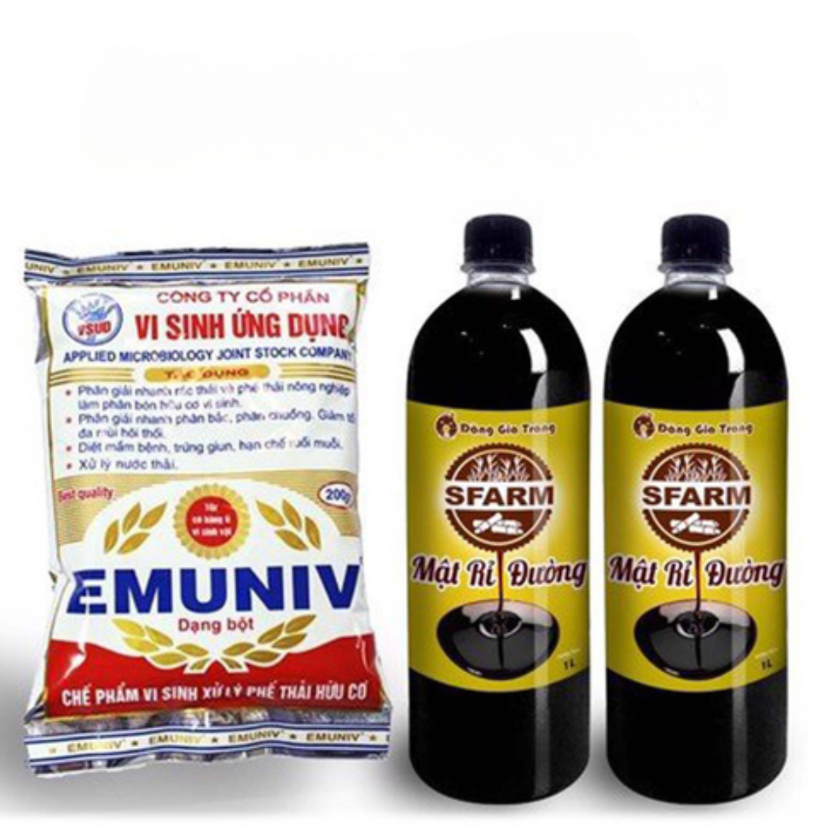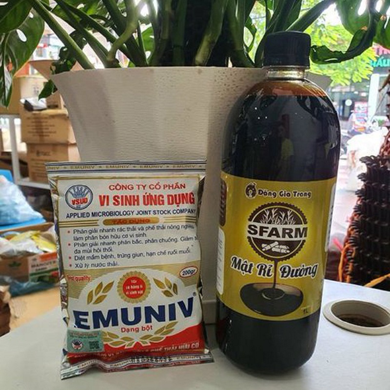 Combo bộ đôi 01 túi chế phẩm ủ rác và phân bón Emuniv 200gram và 02 chai mật rỉ đường loại 1 lít - Tại CH TP. HCM