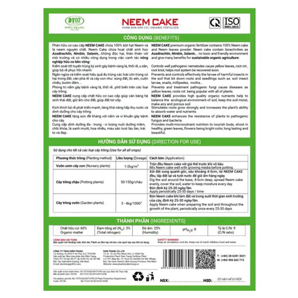 Phân hữu cơ cao cấp Neem Cake chứa 100% bột hạt Neem và lá neem nguyên chất. Neem Cake chứa hoạt chất sinh học Azadirachtin, Nimbin, Salanin,… không độc hại, thân thiện với môi trường và có nhiều công dụng trong việc canh tác nông nghiệp hữu cơ bền vững: