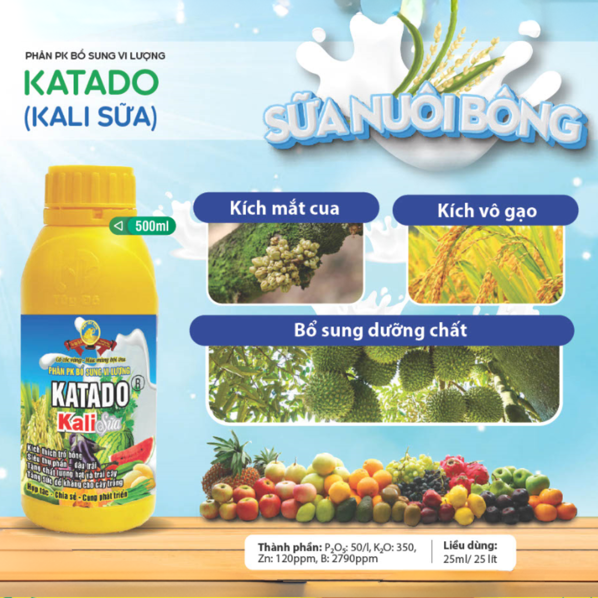Phân bón vi lượng KATADO (Kali sữa) là dòng phân bón bổ sung Lân (P), Kali (K), Kẽm (Zn) và Bo (B) giúp thúc đẩy mạnh mẽ quá trình ra hoa, trổ bông đồng loạt và tăng tỷ lệ đậu trái. Sản phẩm đặc biệt hiệu quả trong giai đoạn phân hóa mầm hoa – thụ phấn – đậu trái, giúp bông to, hoa sáng màu và trái phát triển đồng đều.