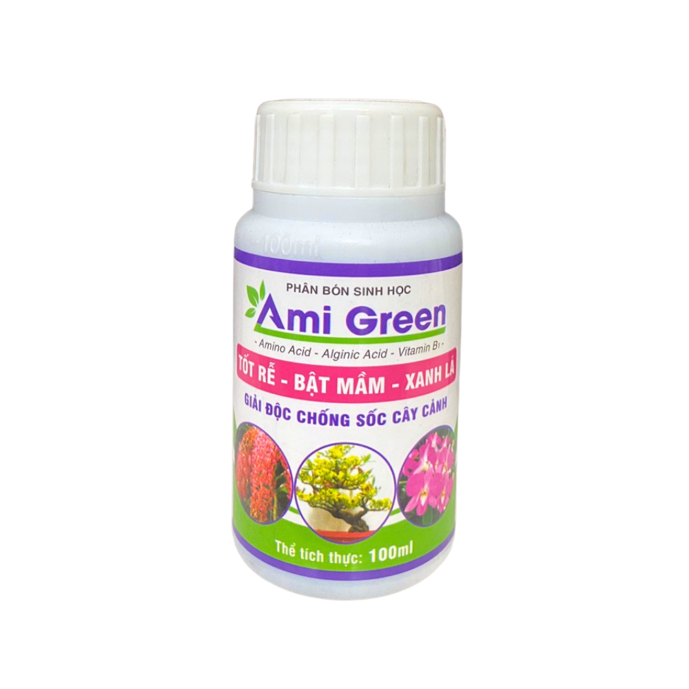 Mô tả: Phân bón sinh học Ami Green với tác dụng chính tốt rễ và bật mầm, thường được sử dụng trên các loại cây như: hoa hồng, hoa lan, kiểng lá, Bonsai,...