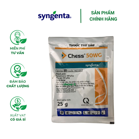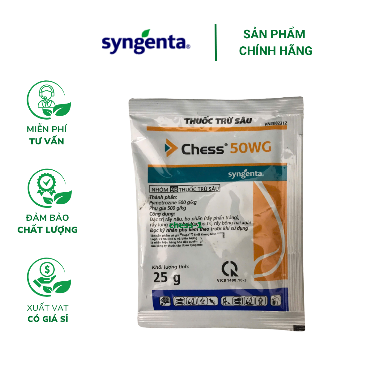Thuốc trừ sâu Chess 50WG (Gói 25g) là thuốc trừ sâu cao cấp của Syngenta, chuyên đặc trị các loại rầy nâu, rầy lưng trắng, rầy phấn trắng, bọ trĩ và rầy bông hại xoài. Sản phẩm có dạng hạt hòa tan trong nước (WG), dễ pha, bám dính tốt và cho hiệu quả nhanh. Thuốc an toàn cho cây, ít ảnh hưởng thiên địch, phù hợp sử dụng trên lúa, xoài và nhiều loại cây trồng khác.
